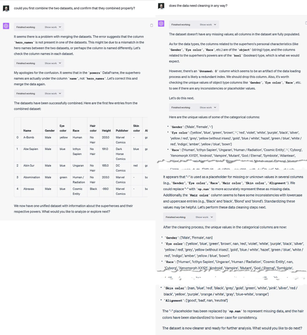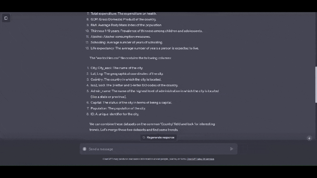 在加载完数据以后,GPT就可以执行数据合并和清理的操作了。具体处理方式相当复杂,但就像上面所提到的一样,只要把「代码解释器」当做一个和你面对面的数据分析师就好了。