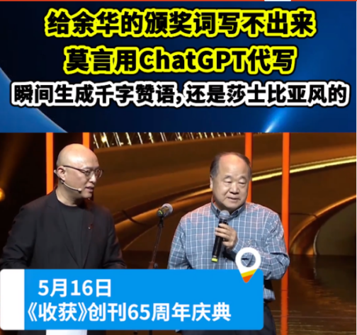 2023年5月16日,在《收获》杂志65周年庆典上,莫言说他想给余华准备颁奖词,但准备了几天也没想出来,最后,他在ChatGPT上输入“活着”“拔牙”“文城”等关键词,瞬间生成1000多字的颁奖词,并且还是莎士比亚风格的赞语,实在让人忍俊不禁。
