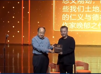 (莫言在《收获》杂志65周年庆典上为余华颁奖)