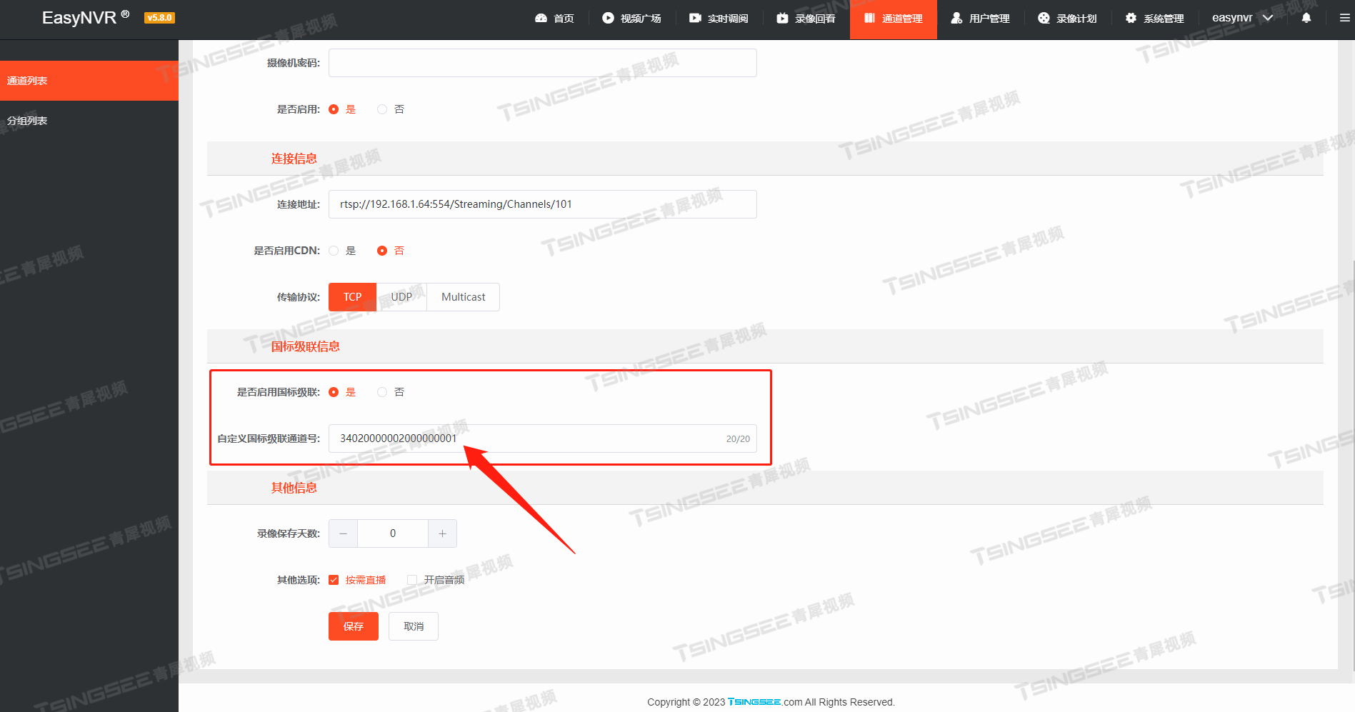 2)配置完成后即可向上推送通道。由于开启国标级联后,EasyNVR中的通道会默认从第一个通道开始递增编码,如需自定义通道的国标编码,可在【通道管理】中编辑: