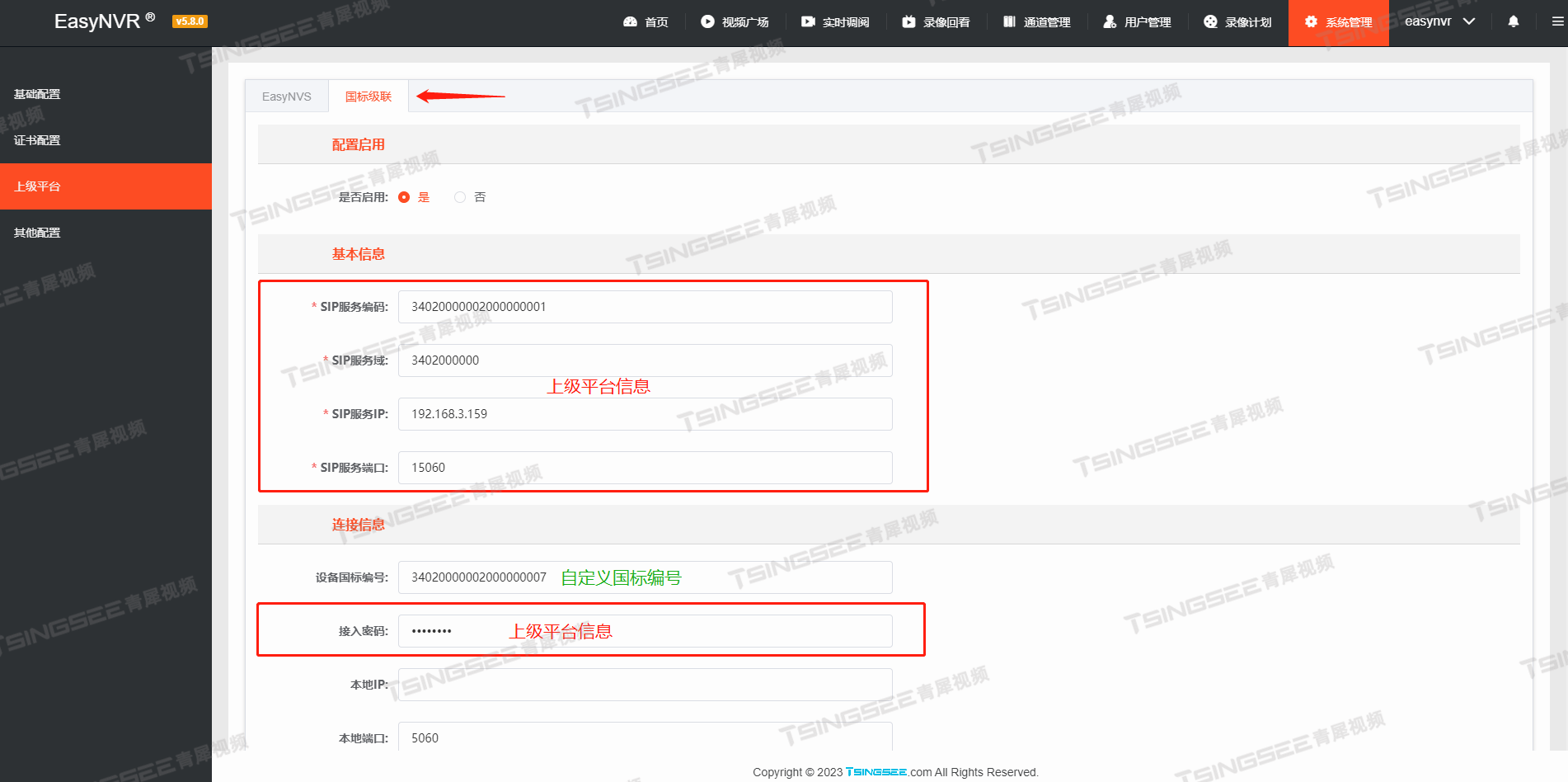 1)首先在【系统管理】-【上级平台】中启用“国标级联”功能,在下图红框部分填入上级平台的SIP信息。注意:其中的”设备国标编号“一般是20位的国标编码,支持自定义,它代表EasyNVR平台向上注册的唯一识别编码,在上级平台以一级目录显示。