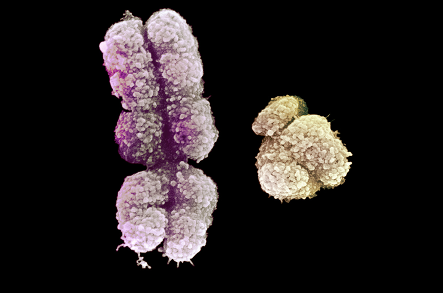 这张扫描电子显微镜图像显示了一对连接的Y染色体(右)与一对连接的X染色体相比,在细胞分裂前期时重复的Y染色体(右)小了多少。图片来源:BIOPHOTO ASSOCIATES/SCIENCE SOURCE