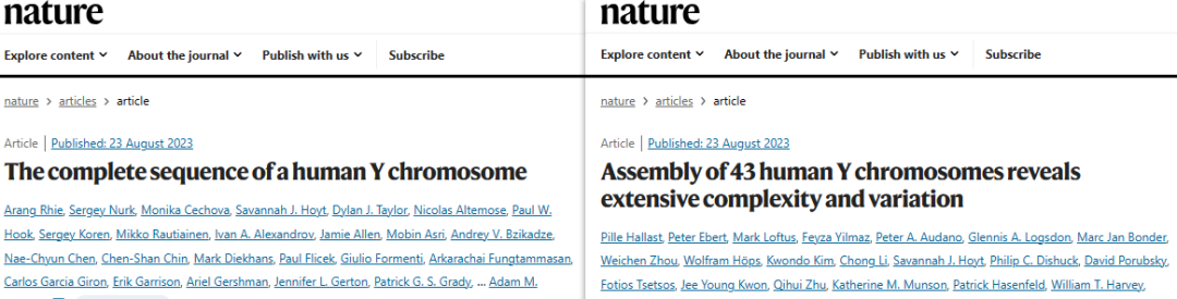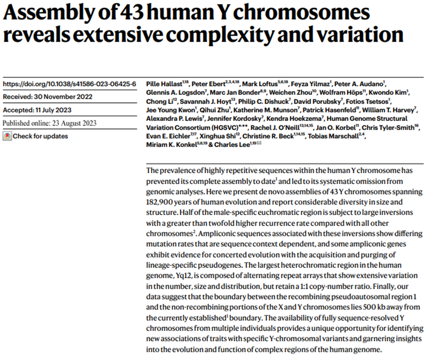 长期以来,Y染色体的全序列测序被认为是一项不可能完成的任务。男性的Y染色体充满了重复和倒置的DNA片段,使得将测序后的DNA片段以正确的顺序重新组装变得极具挑战性。2023年8月23日,在《Nature》(IF2022=64.8)杂志发表的一对论文中,研究人员利用最先进的技术,成功地对来自世界各地的43个男性的Y染色体进行了测序及组装。完成了长期以来令人期待的人类基因组完整测序的最后一步,实现了人类基因组完全测序的目标。