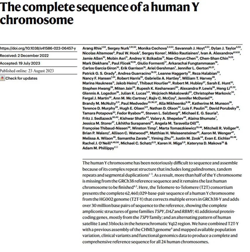 2023年3月,美国国家人类基因组研究所(National Human Genome Research Institute)的生物信息学家Adam Phillippy和端粒到端粒联盟(Telomere-to-Telomere)描述了除Y染色体外的人类基因组的完整测序。当时,该联盟在推特上表示,他们手头有Y染色体的序列。现在,该团队已经分析并详细描述了Y染色体的6200万碱基的复杂排列,增加了之前在早期部分测序后缺失的3000万碱基。“这有点像高清电视——我们以前能看到画面,而这些研究使其变得超级清晰,”莱斯特大学的遗传学家Mark Jobling说,他并未参与这项工作。