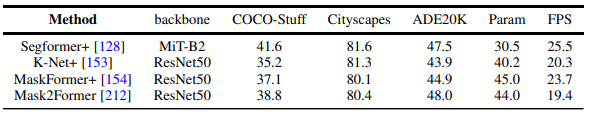 此外,本文还同时对比了近期的Transformer-based的分割方法在多个不同数据集和任务上结果。(语义分割,实例分割,全景分割,以及对应的视频分割任务)