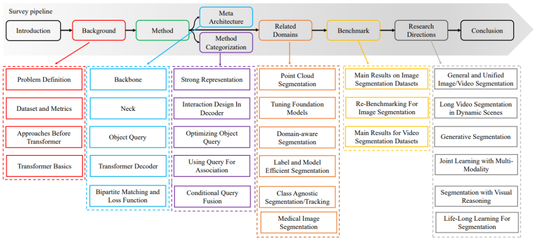 2.1 系统性和可读性。 本文系统地回顾了分割的各个任务定义,以及相关任务定义,评估指标。并且本文从卷积的方法出发,基于ViT和DETR,总结出了一种元架构。基于该元架构,本综述把相关的方法进行归纳与总结,系统地回顾了近期的方法。具体的技术回顾路线如图1所示。