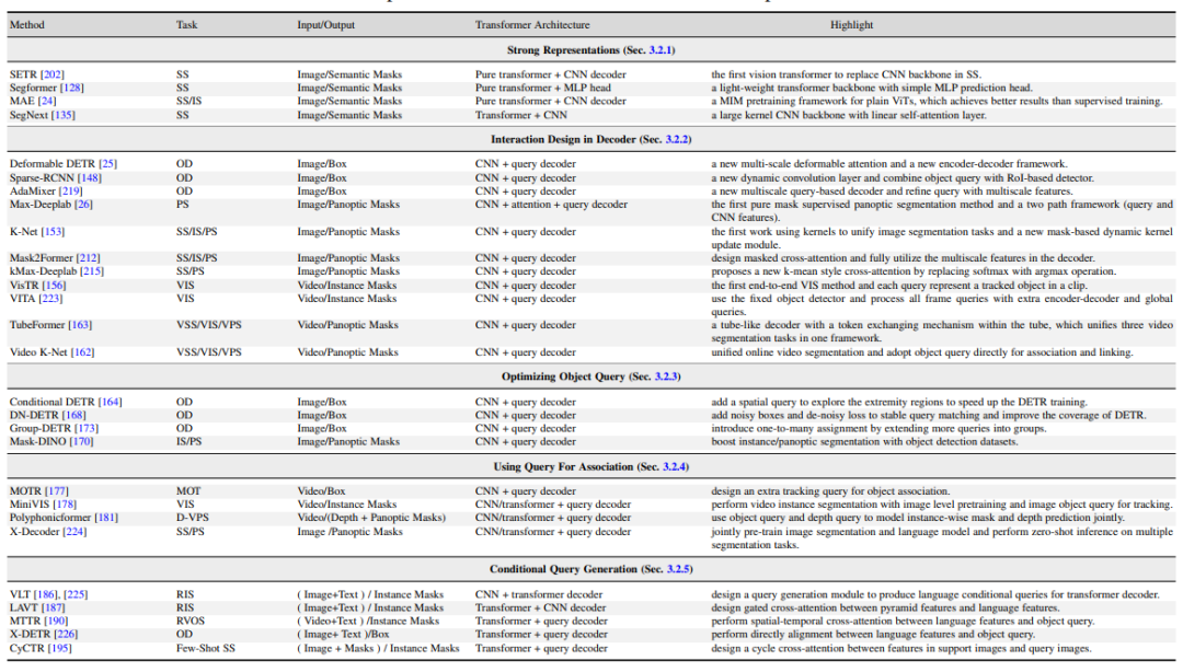 3.2 解码器端的方法设计,Interaction Design in Decoder。 本章节回顾了新的Transformer解码器设计。本文将解码器设计分为两组:一组用于改进图像分割中的交叉注意力设计,另一组用于视频分割中的时空交叉注意力设计。前者侧重于设计一个更好的解码器,以改进原始DETR中的解码器。后者将基于查询对象的目标检测器和分割器扩展到视频领域,用于视频目标检测(VOD)、视频实例分割(VIS)和视频像素分割(VPS),重点在建模时间一致性和关联性。