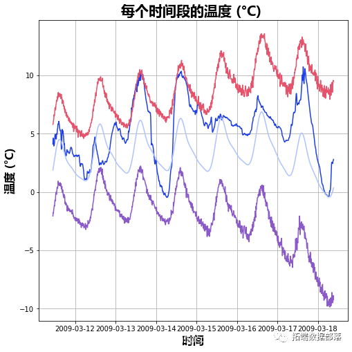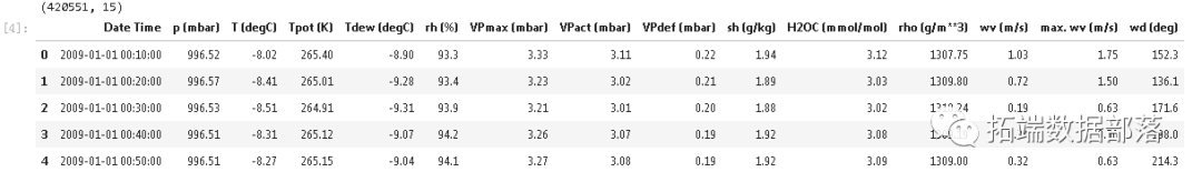 这个例子使用了地球化学研究所记录的天气时间序列数据集。该数据集包含14个不同的特征,如空气温度、大气压力和湿度。这些都是在2003年开始,每10分钟收集一次。我们只使用2009年至2016年期间收集的数据。