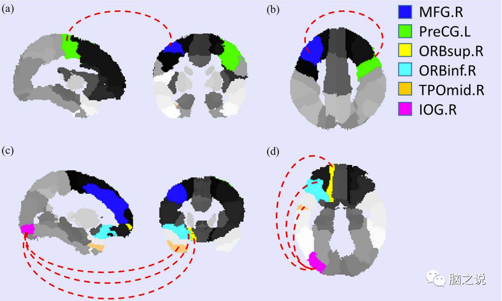 图3 已识别的fc(红线)与母亲抑郁症状有显著相关性,所涉及的皮质区域(用颜色标记)的位置示意图。已识别的fc用矢状面和冠状面图(a、c)和轴向图(b、d)表示。