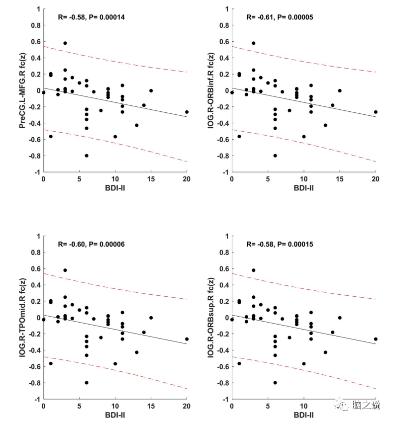 图2 孕晚期母亲抑郁症状与新生儿脑静息状态FC在4个两两区域的显著负相关(P<0.00025)的可视化图表。