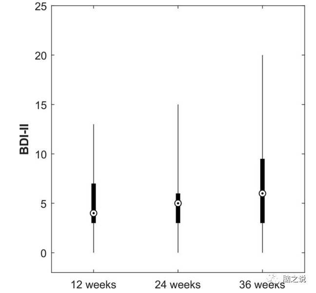图1妊娠12、24、36周产妇BDI-II评分总结怀孕。中位数(白色圆圈),第25和75百分位数(深色)条),以及范围(细线)显示每个时间点。