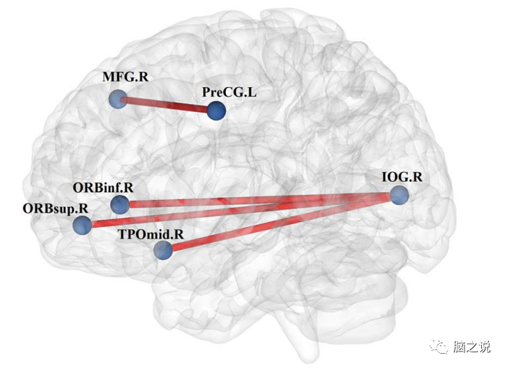 本研究中FC与母亲抑郁症状显著相关的脑区具有重要的功能。例如,PreCG被称为初级运动皮层,负责执行自主运动,据报道,它也在奖励学习中发挥作用。MFG不仅涉及注意和奖励处理,但也从事有助于运动控制的听觉处理、工作记忆和语言处理。在我们的研究中确定的fc可能具有重要的功能意义。例如,据报道,PreCG和MFG之间的FC与心理弹性介导的睡眠质量呈负相。此外,另一项使用皮质电图记录的研究表明,这种连接在儿童和青少年中支持记忆形成和识别精度。其余3个FCs涉及枕叶,与眶额回或颞极回相连。眶额皮质参与奖励处理、学习、情感接触和声音表达识别。时间极与语言和语义记忆加工有。枕叶是大脑的视觉处理区域,下半部分参与人脸处理。眶额回和颞回也参与面部信息处理。