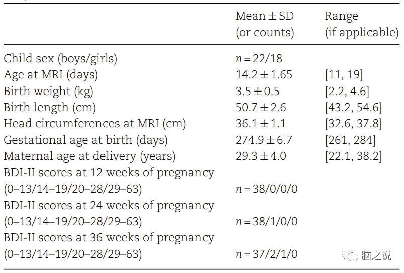 所有研究程序均经阿肯色大学医学科学机构审查委员会批准,所有参与者(孕妇)签署了自己及其新生儿参与本研究的知情同意书。这项研究从阿肯色州儿童营养中心的一项大型临床研究中招募了怀孕期间没有医学并发症的正常孕妇。所有孕妇均为单胎妊娠,入组时年龄为221岁。排除有下列情况者:高血压、糖尿病或其他已知影响胎儿生长的既往疾病;自我报告怀孕期间使用娱乐性药物、烟草或酒精的情况;辅助生育治疗的妊娠;或者怀孕期间出现的已知会影响胎儿生长的疾病。此外,早产儿或患有已知影响生长发育的疾病或药物的新生儿(如出生缺陷、脑畸形或与分娩相关的脑损伤),或无法在自然睡眠期间完成脑MRI检查的新生儿也被排除在外。同时参加抑郁问卷和MRI扫描,43对婴儿同时具有母亲抑郁评分和新生儿RS-fMRI数据。其中3例因数据分析章节中RS-fMRI图像质量问题被进一步排除在本报告之外,其余40例被纳入本报告。纳入受试者的人口学和临床信息见表1。