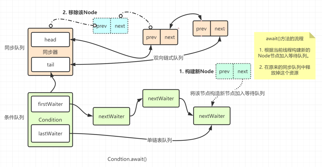 其实就是从AQS同步队列的首节点,注意不是head,而是获取了锁的节点,移动到Condition的等待队列中。