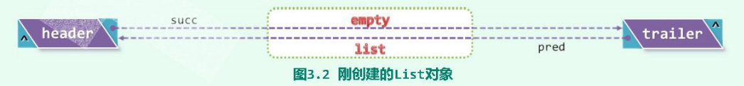 创建 List 对象时,默认构造方法将调用统一初始化过程 init(),在列表内部创建一对头、尾哨兵节点,并适当地设置其前驱、后继指针构成一个双向链表。