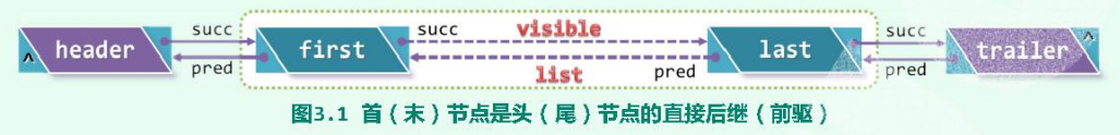 其中私有的头节点(header)和尾节点(trailer)始终存在,但对外并不可见。对外部可见的数据节点如果存在,则其中的第一个和最后一个节点分别称作首节点(first node)和末节点(last node)。