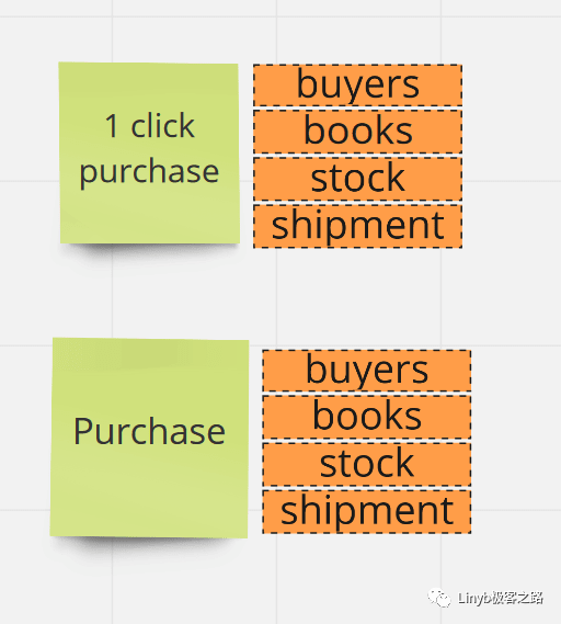 每个产品的成功都应独立衡量和发展。但是,正如您所注意到的,某些跨产品模块可能存在依赖性。例如,一键购买(1 click purchase)产品类似普通购买(purchase)产品,它们可能取决于库存和用户信息。 我们如何确保那些依赖关系不会影响团队绩效并且我们不重复逻辑? 首先,我们需要将产品切成模块,以了解可能发生耦合的地方: