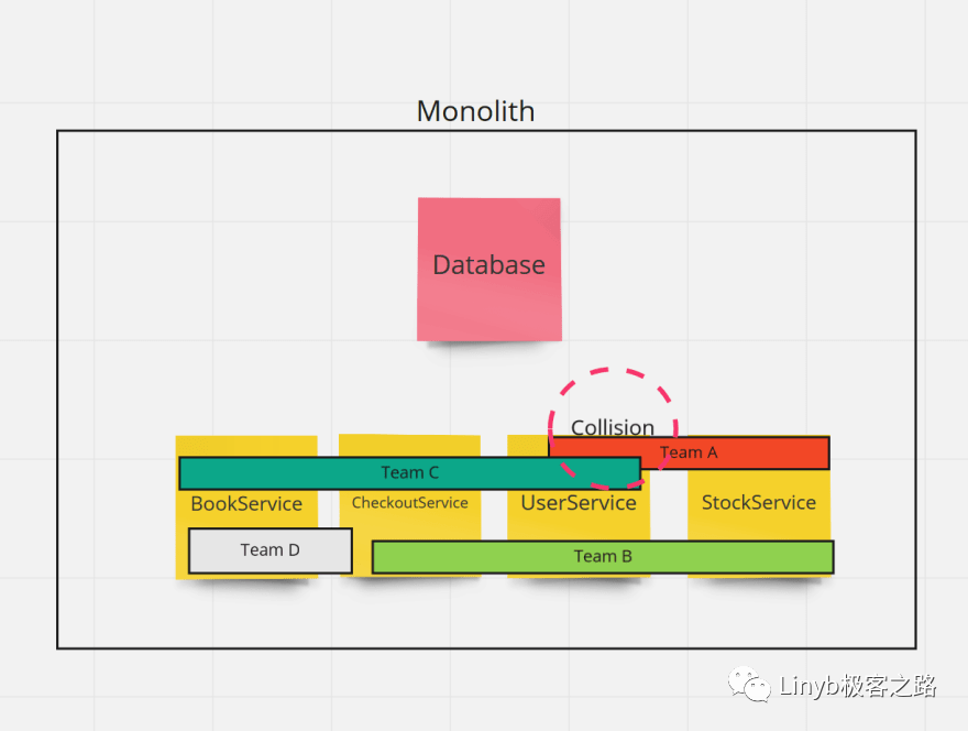 因为没有解决此问题的简单方法,所以解决方案是拆分整体。要了解在同一代码中拥有不同团队的复杂性,只需参考使两个线程在内存中使用同一组数百个变量的复杂性即可。 因此,经过几个月或几年的工作,我们将这种单体整体分成了微服务。我见过的最常见的分割整体的方法是定义数据边界的策略。例如,所有与用户相关的数据将最终出现在UserService中,StockService中的库存信息等等。 这种方法的问题在于: