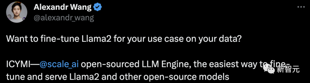 创办Scale AI初创公司的华人CEO Alexandr Wang表示,自家公司开源的LLM Engine,能够用最简单方法微调Llama 2。