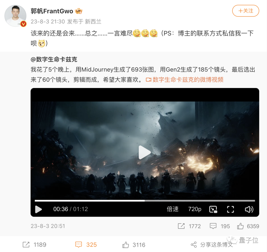 这段72秒的预告片是博主@数字生命卡兹克在微博、B站等多个平台同时发布的。
