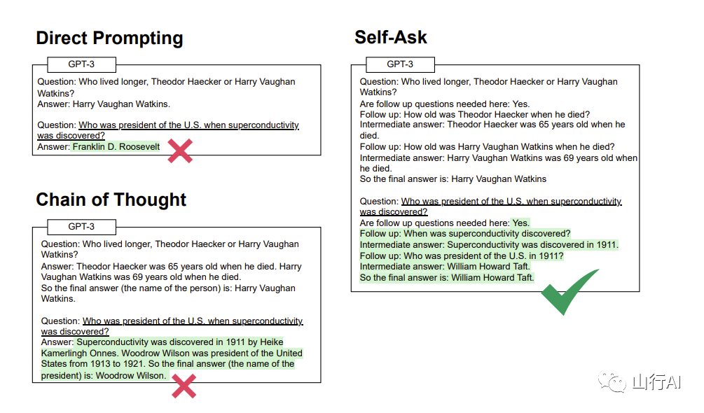 > "Alanis Morissette是最近发布了专辑名为'The Storm Before the Calm'的艺术家,她在FooBar数据库中的专辑是'Jagged Little Pill',总时长为3,450,925毫秒。"正如您所见,通过整合外部搜索功能、数据库访问和其他工具,您可以使用LLMs作为自然语言界面与系统进行交互,构建一个非常强大的应用程序。最后我们来看一下《自问问题搜索》(Self-Ask-With-Search[14]),这篇论文涉及可组合性——让语言模型执行组合推理任务,其中整体解决方案取决于正确地组合子问题的答案。下面是该方法与 CoT 的比较: