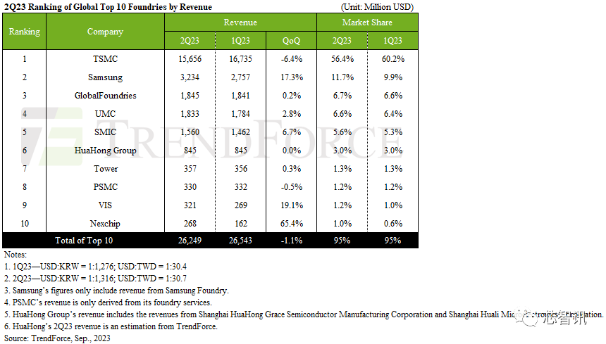 9月5日,市场研究机构TrendForce发布了2023年二季度全球十大晶圆代工厂的销售额排名,台积电仍稳居第一,占据了56.4%的市场份额,其后的分别是三星、格芯、联电、中芯国际、华虹集团、高塔半导体、力积电、世界先进、晶合集成。前十厂商的总体营收环比下滑了约 1.1%,降至262亿美元。