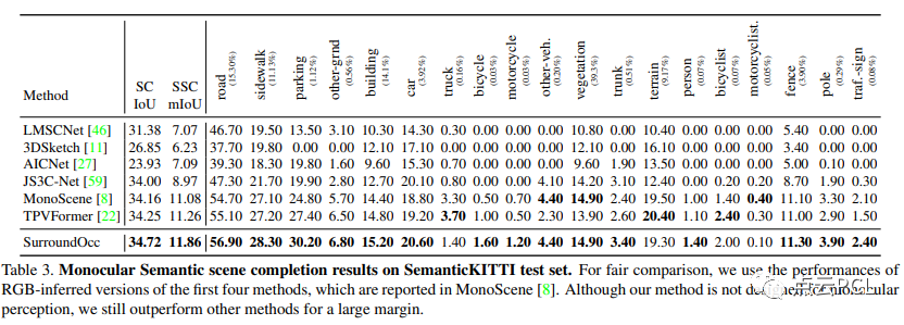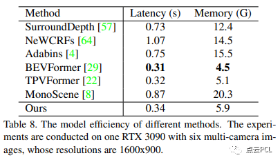 表3显示了结果,尽管我们的方法并不是为单目感知而设计的,并且跨视图注意力在单目设置下会失效,但该方法仍在这一基准上取得了最先进的性能。