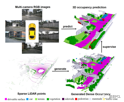 图1. SurroundOcc的概览,给定多摄像头图像,我们的方法可以预测周围3D场景的体积占用情况。为了训练网络,我们设计了一个流程,可以使用稀疏的LiDAR点生成稠密的占用标签。