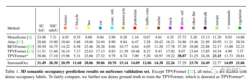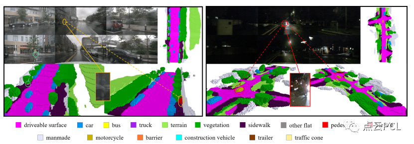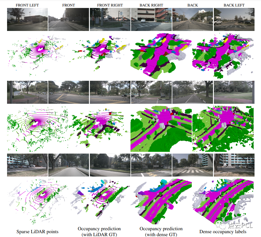 图7。在nuScenes验证集上的可视化。我们生成的密集占用标签比稀疏的LiDAR点密集得多。在密集的地面实况下训练,网络可以预测更好和更密集的占用。