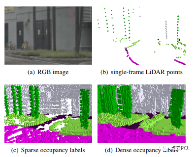 图5. 不同占用标签的比较,与单帧LiDAR点和从多帧点转换而来的稀疏占用相比,稠密的体素能够提供更真实的占用网格标签。