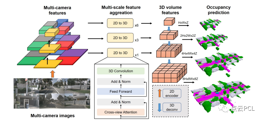 图2. 所提方法的流程。首先使用主干网络提取多摄像头图像的多尺度特征,然后,我们采用2D-3D空间注意力来融合多摄像头的信息,以多尺度方式构建3D体积特征。最后,使用3D反卷积层来上采样3D体积,并在每个级别对占用预测进行监督。