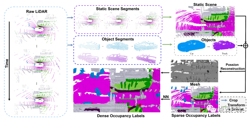 图4. 稠密的占用真值生成。首先,我们遍历所有帧,将动态物体和静态场景的多帧LiDAR点分别拼接,然后将它们合并成一个完整的场景。随后,我们使用Poisson Reconstruction来使点密度增加,并对生成的网格进行体素化,以获得密集的3D占用情况。最后,我们使用最近邻(NN)算法为密集体素分配语义标签。