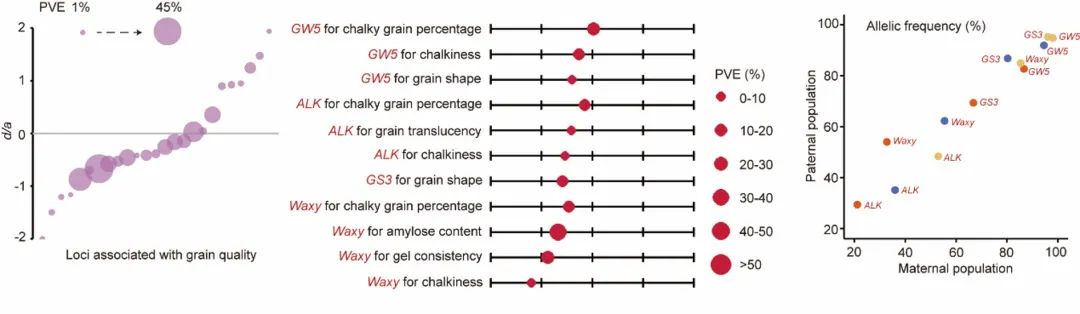 此外,该研究通过全基因组关联分析定位了调控杂交稻产量和品质的主效位点。联合位点的基因型频率变化趋势分析和位点显性度及表型贡献率的量化分析,该研究指出育种通过位点的遗传效应,选择合适基因型进行性状改良。其中,以稻米品质为例,多数主效位点表现为负向显性效应,这与品质较难表现出杂种优势的固有印象是相符的,同时也意味着杂合基因型会拖后腿。因此改良育种通过双亲协同改良,在目标基因座上同时为双亲配备优势等位基因型,使得F1能够获得优势纯合基因型。这也给杂交稻育种提供了一些启示:对于显性(部分显性)效应位点可以选择只改良一个亲本,超显性位点需使双亲拥有不同基因型,而加性效应或者负向显性效应位点必须实现双亲协同改良,才能最大化杂种优势效应。