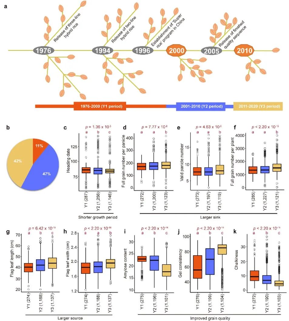 该研究通过分析2,839份杂交稻品种的表型变化趋势,回顾了改良育种的成就:1. 库器官显著增大,包括每穗粒数和有效穗数。库器官的增大搭建了材料的高产架子,为产量提升打下了基础。2. 为了配合增大的库器官,源器官显著增大,包括主要光合器官剑叶的叶长和叶宽,以提高源器官的灌浆能力;3. 抽穗期稍缩短。水稻生育后期(灌浆期)的气候条件多变,极端天气可能影响水稻的产量,甚至导致颗粒无收。稍缩短的抽穗期可以降低材料在生育后期遇上极端天气的风险,从而提高材料的稳产性能;4. 籽粒蒸煮品质和外观品质显著提升。早期杂交稻的稻米品质较差,通过育种家的不懈改良,稻米品质得到显著提升。