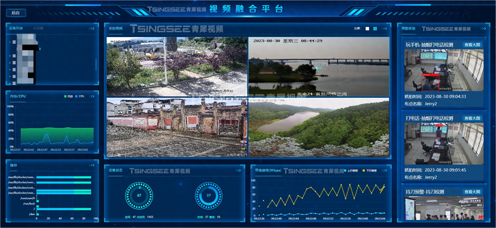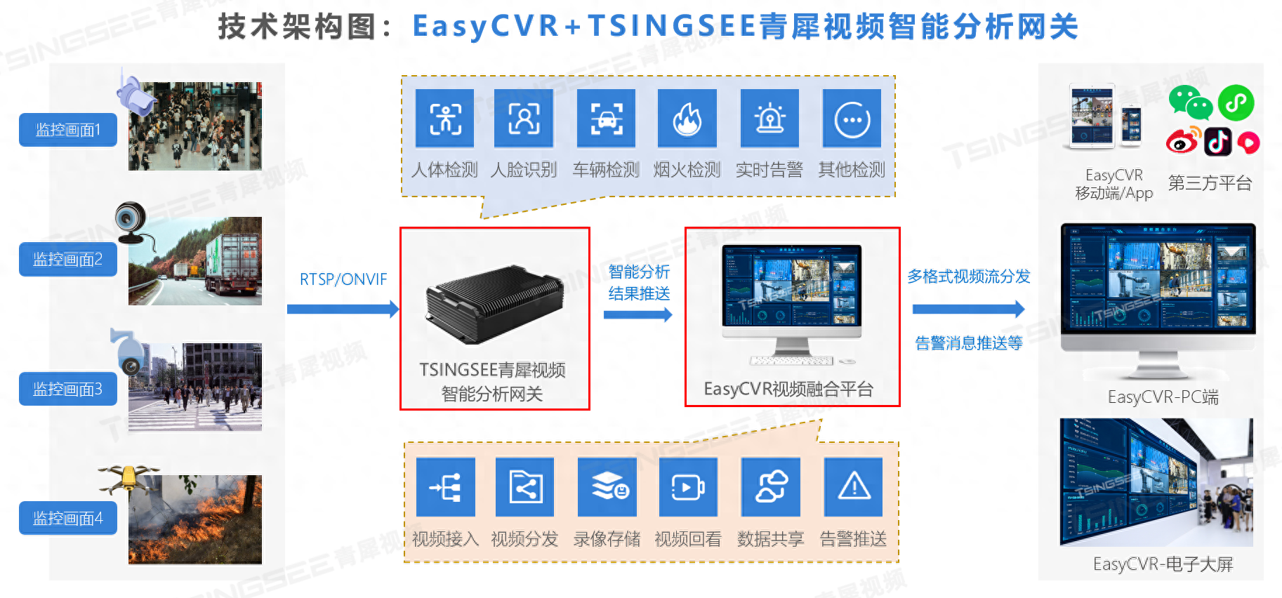 视频监控管理平台/视频集中存储/云存储平台EasyCVR能在复杂的网络环境中,将分散的各类视频资源进行统一汇聚、整合、集中管理,实现视频资源的鉴权管理、按需调阅、全网分发、智能分析等。AI智能大数据视频分析EasyCVR平台已经广泛应用在工地、工厂、园区、楼宇、校园、仓储等场景中。感兴趣的用户可以前往演示平台进行体验或部署测试。