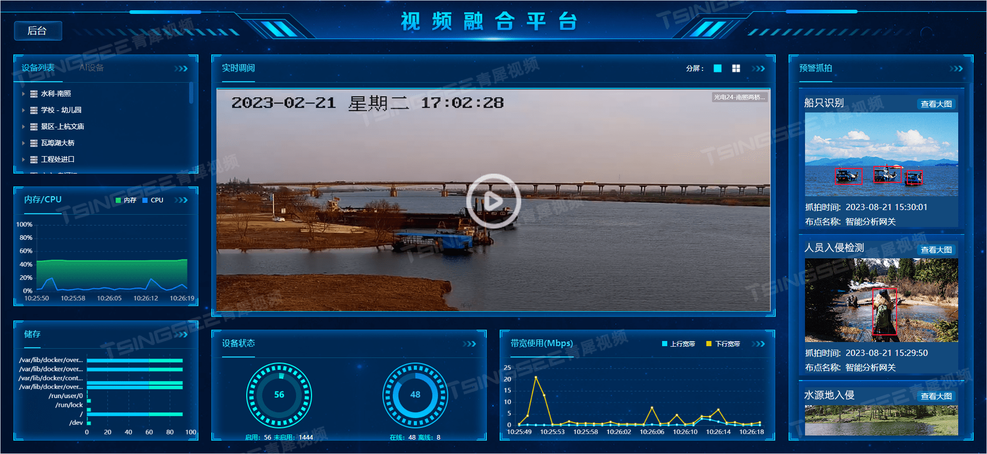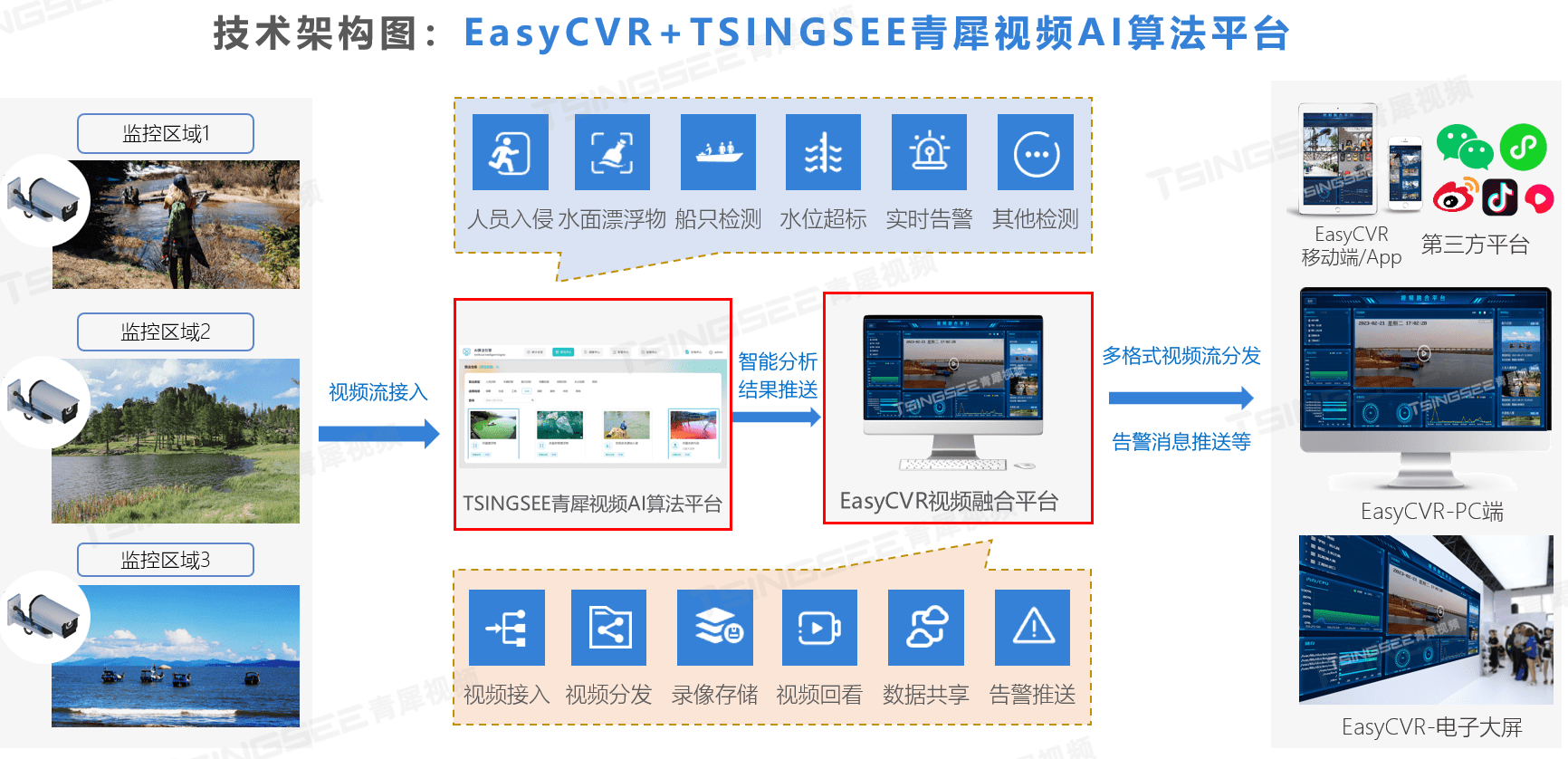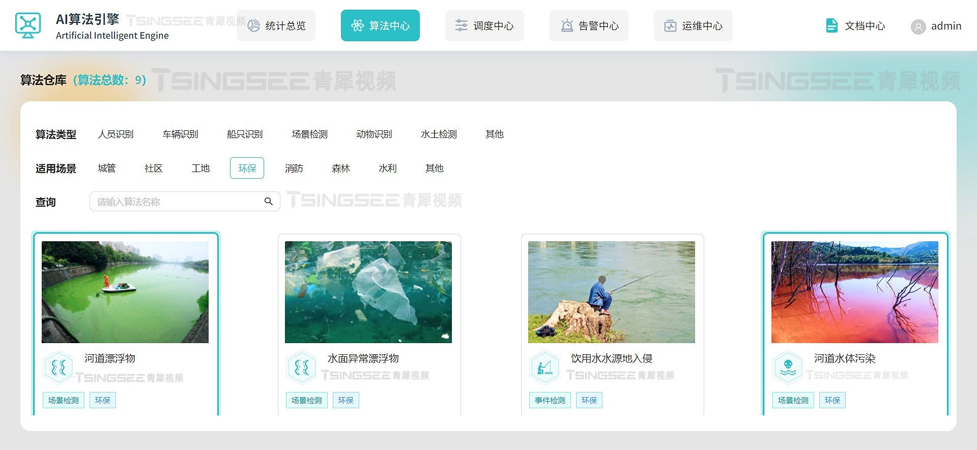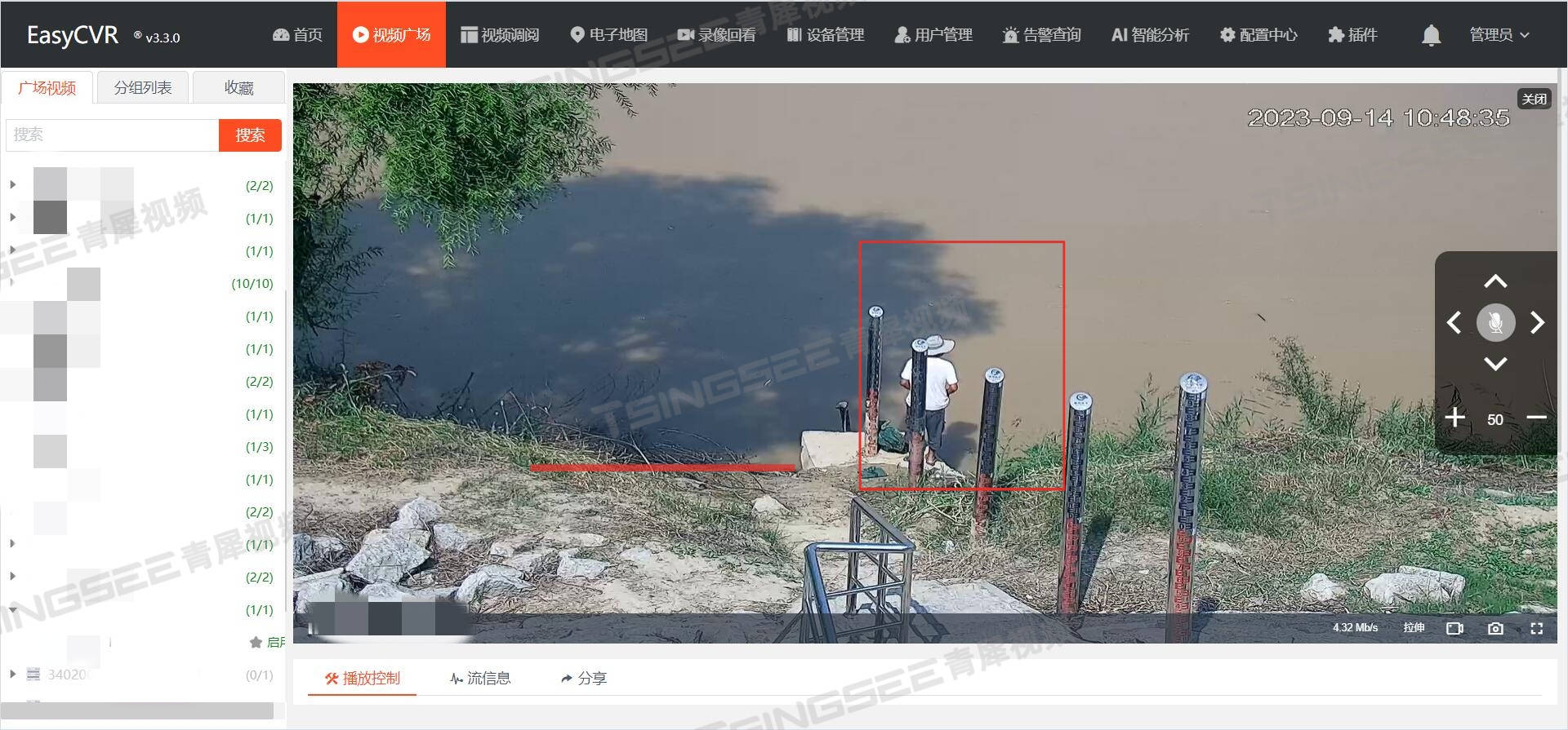 3)水面异常漂浮物:TSINGSEE青犀视频AI智能算法平台支持识别江河湖泊、水库、鱼塘等水域表面存在的异常漂浮物,包括水面垃圾、塑料、水葫芦、水藻、凌汛等;
