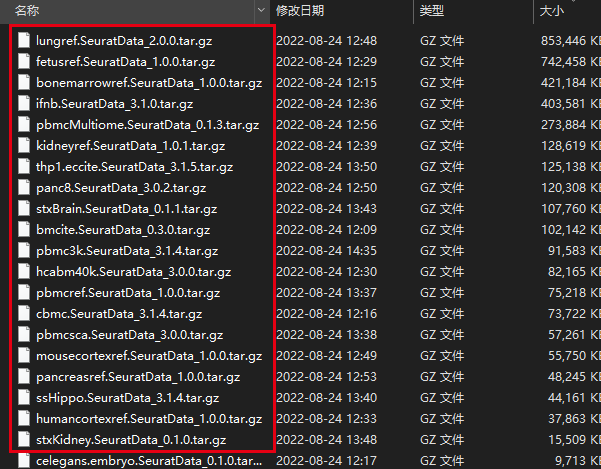 因为上面的文件名字太长了,而且文件名的规则有点乱,需要从里面切割出来我们的包的名字,有点难度哦!但是之前看到的另外一系列本地包就很容易切割,详见:听说你无法下载SeuratData的单细胞示例数据 :