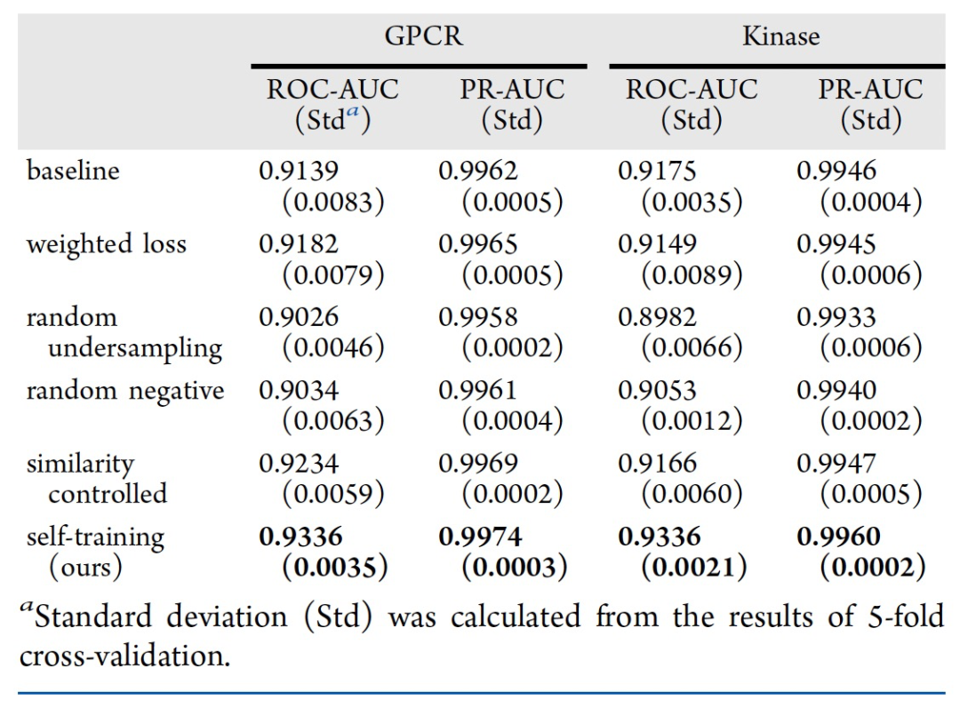 在ChEMBL上的性能:为了验证自我训练在CPI预测中的有效性,作者对ChEMBL数据集进行了5折交叉验证。如表2所示,在GPCR和激酶家族的内部数据集上,基线模型的平均ROC-AUC分数分别为0.9139和0.9175。通过将自我训练方法应用于不平衡数据,正负样本的数量逐步逼近,并且每个蛋白质中正样本的比例在最终迭代时收敛到0.5。使用更新的数据训练的模型在GPCR(0.9336)和激酶(0.9336)的ROC-AUC分数上表现稍好。这种改进可以归因于数据分布的扩展和数据不平衡的解决。此方法的性能优于随机负样本模型(GPCR:0.9034,激酶:0.9053)。这种改进是可以预期的,因为基于预测分数生成的样本会比随机配对的负样本更可信。模型性能也优于其他方法(表2)。