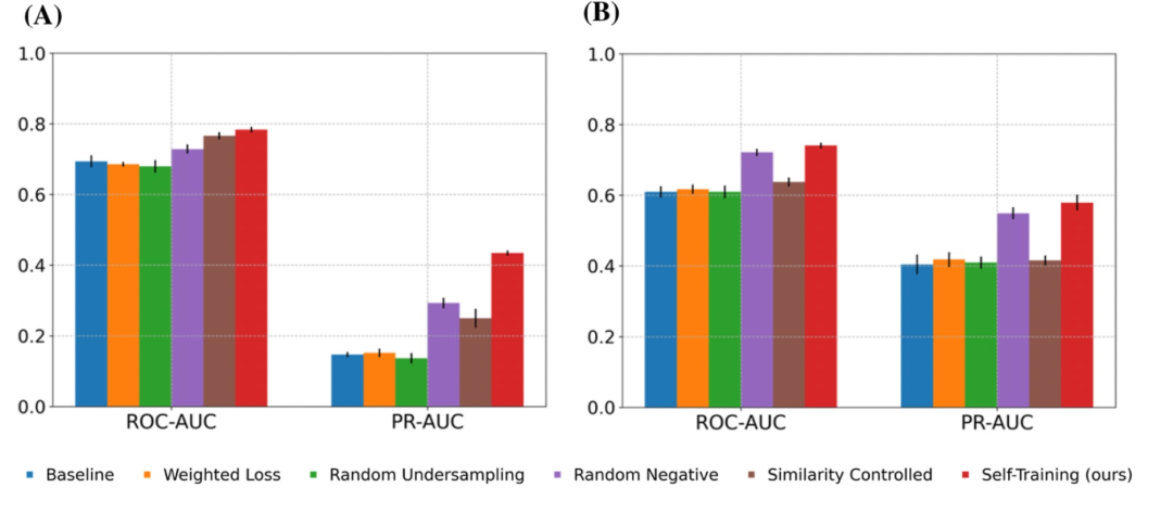 在外部数据集BioPrint、Davis和BindingDB上的性能:为了评估目前构建模型的泛化能力,作者比较了模型在外部数据集上的性能,其中BioPrint适用于GPCR家族,Davis适用于激酶家族。在这里采用了PR-AUC分数作为主要指标,该指标更适用于评估在由负样本主导的不平衡数据集上的模型性能。模型在BioPrint和Davis数据集上表现出更好的性能,其PR-AUC分数分别为0.4344和0.5792,比基线模型分别提高了28.7%和17.5%(图2)。作者的方法在解决数据不平衡方面也优于其他方法。第二好的随机负样本模型的PR-AUC分数分别为0.2927和0.5491。这些结果表明,自我训练方法可以显著提高模型在外部数据集上的鲁棒性。