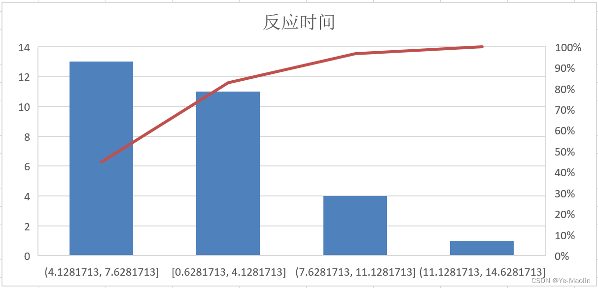根据记录的时间绘制排列图如下图所示,其中横坐标为时间区间,纵坐标为落在区间中的数目,可知大多数的反应时间是在4秒到7秒之间。