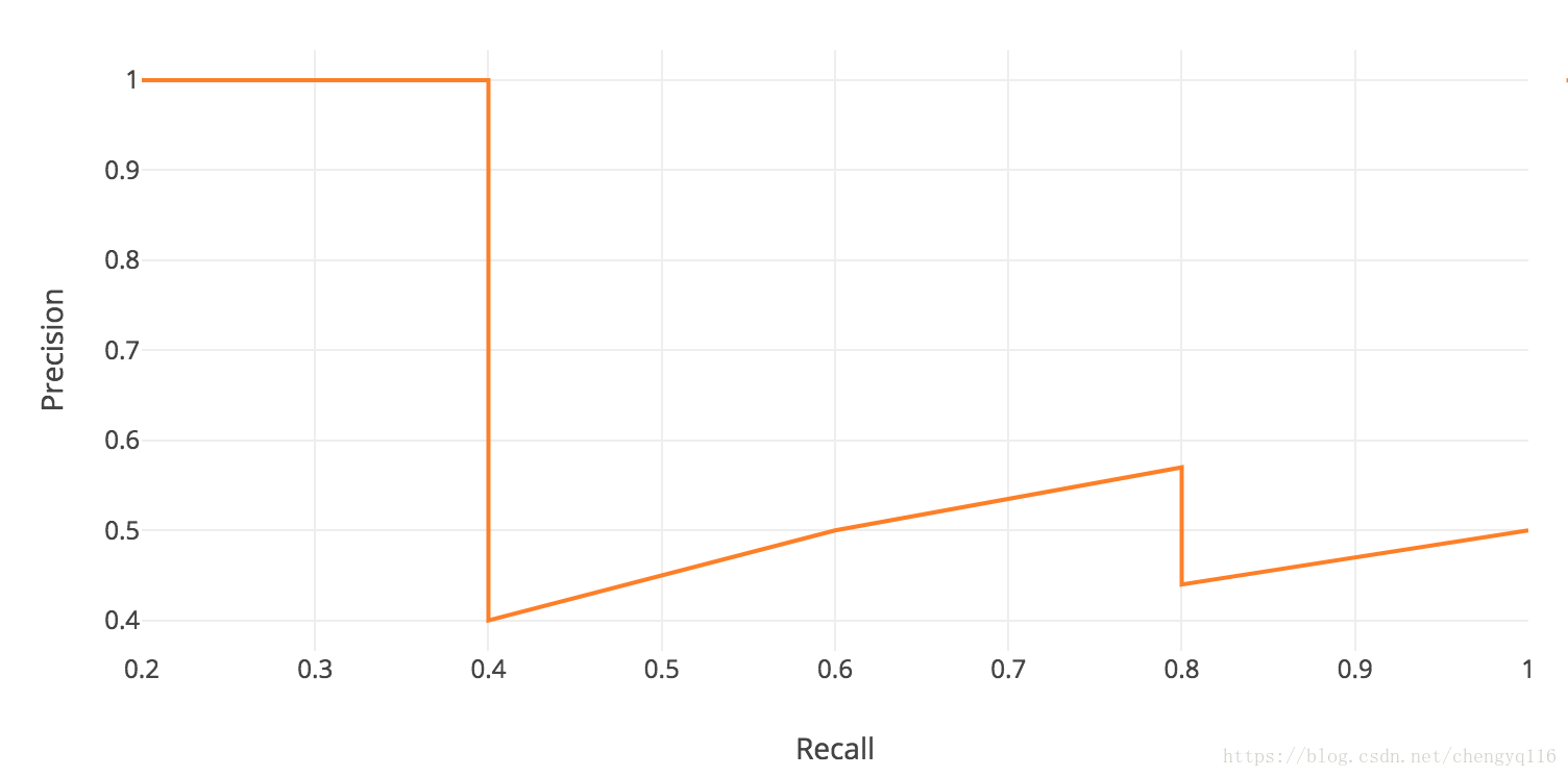 Rank代表第几次预测,计算第3行的精度和收回值。精度是TP = 2/(2 + 1) = 2/3 = 0.67的比例。召回率是TP在可能的阳性结果中所占的比例2/(2 + 3)= 2/5 = 0.4。当包含更多的预测时,召回率会增加,但精确度会上下波动。用召回的精确度来绘制图表: