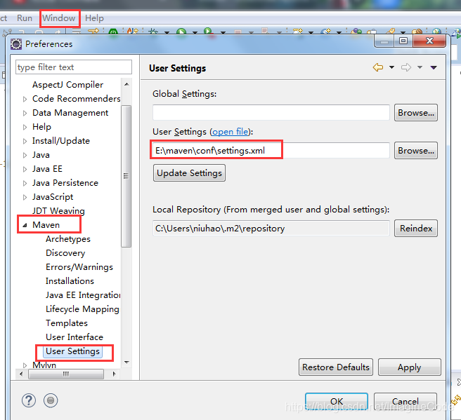 </mirrors>然后,回到Eclipse中配置Maven: windows系统,在Eclipse的window菜单下找到Preferences: