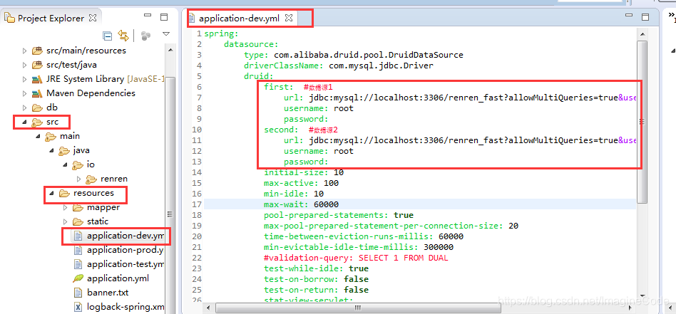 接着,回到Eclipse中修改数据库连接信息,在src\main\resources目录下找到:application-dev.yml文件,修改username和password: