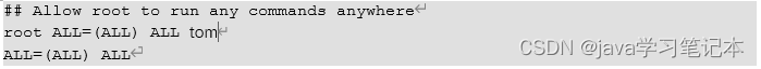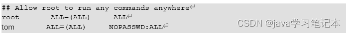 1)添加 tom 用户,并对其设置密码。 [root@hadoop101 ~]#useradd tom [root@hadoop101 ~]#passwd 123456 2)修改配置文件 [root@hadoop101 ~]#vi /etc/sudoers [root@hadoop101 ~]#vi /etc/sudoers 修改 /etc/sudoers 文件,找到下面一行(91 行),在 root 下面添加一行,如下所示: