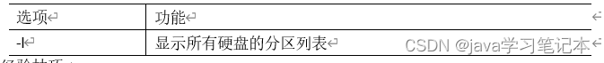 3) 经验技巧 该命令必须在 root 用户下才能使用 4) 功能说明 (1) Linux 分区 Device:分区序列 Boot:引导 Start:从X磁柱开始 End:到Y磁柱结束 Blocks:容量 Id:分区类型ID System:分区类型 (2) 分区操作按键说明 m:显示命令列表 p:显示当前磁盘分区 n:新增分区 w:写入分区信息并退出 q:不保存分区信息直接退出