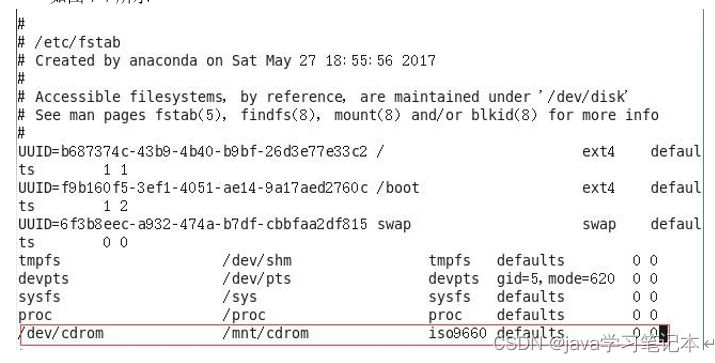 案例实操 (1)挂载光盘镜像文件 [root@hadoop101 ~]# mkdir /mnt/cdrom/ [root@hadoop101 ~]# mount -t iso9660 /dev/cdrom /mnt/cdrom/ 挂载到挂载点: /mnt/cdrom中 [root@hadoop101 ~]# ll /mnt/cdrom/ 建立挂载点 设备/dev/cdrom (2)卸载光盘镜像文件 [root@hadoop101 ~]# umount /mnt/cdrom 5)设置开机自动挂载 [root@hadoop101 ~]# vi /etc/fstab 添加红框中内容,保存退出。