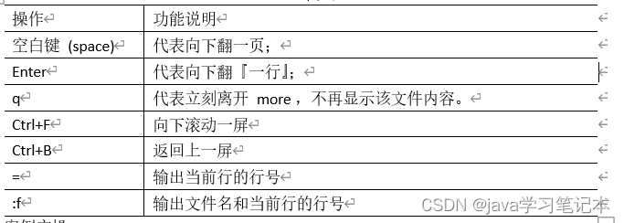 文件内容分屏查看器 more 指令是一个基于 VI 编辑器的文本过滤器,它以全屏幕的方式按页显示文本文件的内容。more 指令中内置了若干快捷键,详见操作说明。 1) 基本语法 more 要查看的文件 2) 操作说明