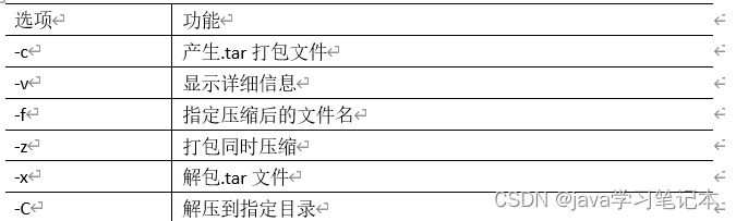 打包 1) 基本语法tar [选项] XXX.tar.gz 将要打包进去的内容 (功能描述:打包目录,压缩后的 文件格式.tar.gz) 2) 选项说明