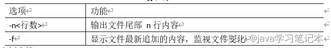 输出文件尾部内容 tail 用于输出文件中尾部的内容,默认情况下 tail 指令显示文件的后 10 行内容。 1) 基本语法 (1)tail 文件 (功能描述:查看文件尾部10行内容) (2)tail -n 5 文件 (功能描述:查看文件尾部5行内容,5可以是任意行数) (3)tail -f 文件 2) 选项说明 (功能描述:实时追踪该文档的所有更新)