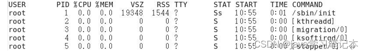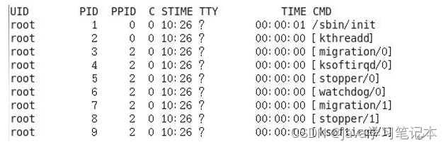 功能说明 (1)ps aux 显示信息说明 USER:该进程是由哪个用户产生的 PID:进程的 ID 号 %CPU:该进程占用 CPU 资源的百分比,占用越高,进程越耗费资源; %MEM:该进程占用物理内存的百分比,占用越高,进程越耗费资源; VSZ:该进程占用虚拟内存的大小,单位 KB; RSS:该进程占用实际物理内存的大小,单位 KB; TTY:该进程是在哪个终端中运行的。对于 CentOS 来说,tty1 是图形化终端, tty2-tty6 是本地的字符界面终端。pts/0-255 代表虚拟终端。 STAT:进程状态。常见的状态有:R:运行状态、S:睡眠状态、T:暂停状态、 Z:僵尸状态、s:包含子进程、l:多线程、+:前台显示 START:该进程的启动时间 TIME:该进程占用 CPU 的运算时间,注意不是系统时间 COMMAND:产生此进程的命令名 (2)ps -ef 显示信息说明 UID:用户 ID PID:进程 ID PPID:父进程 ID C:CPU 用于计算执行优先级的因子。数值越大,表明进程是 CPU 密集型运算,执行优先级会降低;数值越小,表明进程是 I/O 密集型运算,执行优先级会提高 STIME:进程启动的时间 TTY:完整的终端名称 TIME:CPU 时间 CMD:启动进程所用的命令和参数 4) 经验技巧如果想查看进程的 CPU 占用率和内存占用率,可以使用 aux; 如果想查看进程的父进程 ID 可以使用 ef;